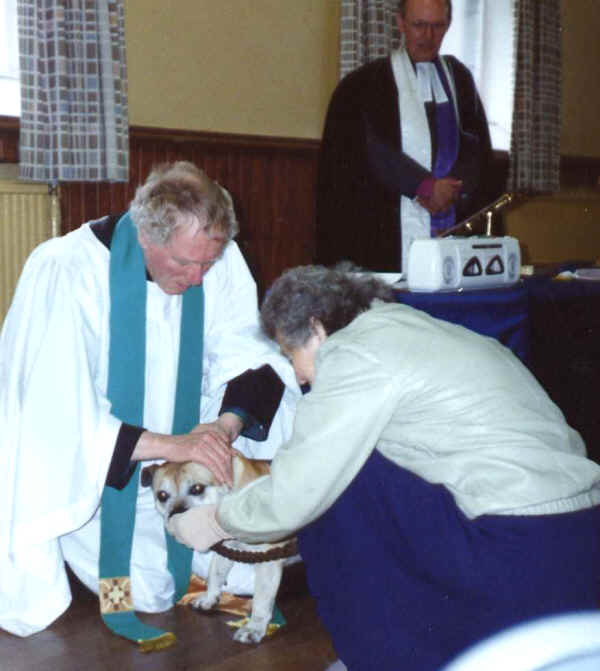 The photo is one of the mid eighties. I’m blessing a doggy while the parish minister, who graciously assisted, looks on This was one of the first such services, and the numbers subsequently attending quite dramatically increased down the years. This was quite an innovation in those middle eighties and such an invitation followed after my own type of animal blessing within the Episcopal church, of which I was priest, had received resounding publicity via both press and TV coverage.