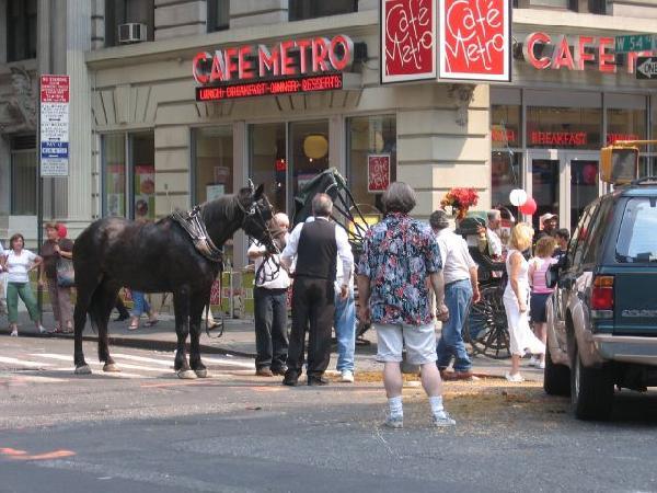 A young horse spooks on Seventh Avenue and 56thSt. and gallops into traffic still attached to his carriage. At 54th St., he is hit by an SUV and falls to the pavement. The Department of Health veterinarian deems him ready to go back to work only two days later. Unfortunately, this accident is not reported in the media - the account and photos are courtesy of a quick thinking passerby, Steve McNally. See newsletter # 32 and #33 on www.banhdc.org for more information.