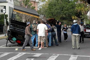Carriage Horse Makes Mad Dash - A carriage horse that slipped its bridle raced down South Battery on Wednesday afternoon, and at least six of the 13 people aboard were injured when the carriage tipped over while turning onto Meeting Street. "One elderly lady has a shoulder problem. I don't know if it's a broken clavicle or what, but they are X-raying it," said David Compton, owner of Old South Carriage Co. "Hopefully, that's the worst of it." Six people were taken to local hospitals, a Charleston Police Department report stated. By late Wednesday, all had been treated and released, Compton said. Carriage driver Jodie Shearer told police that the horse's bridle came loose and fell off, according to the report. She told police the left side of the runaway carriage hit a curb while turning onto Meeting Street, sending the carriage several feet into the air. The carriage landed on its right rear wheel, which shattered, and then overturned, throwing the tourists to the street and landing on at least one of them, the police report said. Compton said the accident is the sort of thing that happens "once in a blue moon." Police filed no charges related to the carriage wreck, which happened at 1:45 p.m.