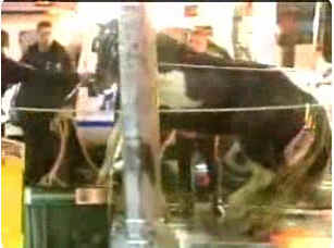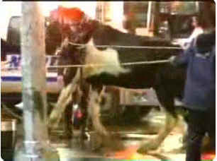 Spotty, a five year old gelding from West Side Livery -- only in NYC for a few months -- is shown limping on his left front leg. He is terrified and resistant as he is led away to be euthanized after injuring his leg in this accident.
