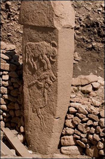 Fast forward now 20,000 years to a period about 11,000 years ago, and to an archeological site known as Gobekli Tepe in what is now Turkey. One thing that stands out is the contrast in the portrayals of the humans and the other animals. Lrge T-shaped pillars clearly represent humans, and the portrayal of the other animals, with their small size and low positioning, suggests a relationship that is no longer one of equality.