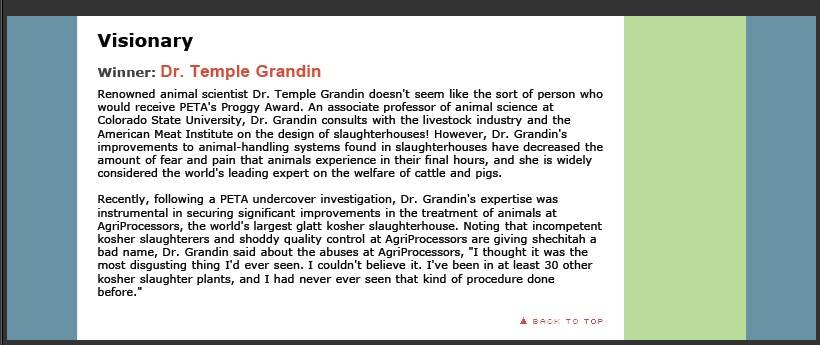 The primary reason why we think that design can make exploitation “humane” in some morally acceptable way is that there are animal advocates, such as Ingrid Newkirk of PETA, who put their stamp-of-approval on people like Grandin and the “solutions” she provides. PETA gave an award to Grandin, declaring her as a “Visionary” and as “the world’s leading expert on the welfare of cattle and pigs.”