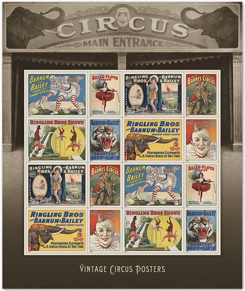On a recent visit to the post office, I was aghast to see an ad for a set of newly issued stamps "commemorating" vintage circus posters. The images specifically advertise the Ringling Bros. and Barnum & Bailey Circus, and in addition to the old-time clowns and acrobats, they depict growling tigers and festooned elephants, and snarling tigers riding elephants.