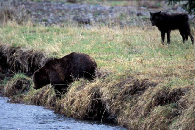 Wolves watching Grizzly, Yellowstone National Park