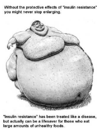One of insulin’s primary jobs is to push fat into the fat cells – thus saving fat for the day when no food is available (which for Westerners never comes). If it were not for the adaptive mechanisms which allow for the development of “insulin resistance,” people would commonly expand until they became so large that they could not get out of bed or fit through a doorway – a very rare condition that does occur in 1000-pound sized people who need a forklift to move them to the hospital. (They make headlines in the newspaper.)
