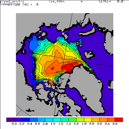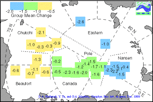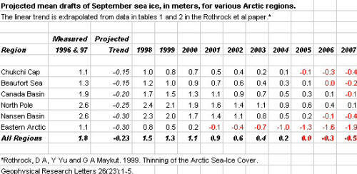 However, melting of the Arctic sea ice will have a dramatic effect on the albedo (reflectivity) of the Earth's surface in the Arctic region. The lower albedo of open ocean will mean less solar energy reflected back into space. It will instead be absorbed by the ocean. The warmer water will melt more sea ice, and eventually the warmer atmosphere above the warmer water will melt more of the ice sheets on Greenland. Since sea ice and sheet ice both consist of fresh water, the result will be a huge increase in the amount of fresh water in the Arctic Ocean. This could possibly lead to a shutdown of the North Atlantic thermohaline circulation and drastic cooling of temperatures everywhere. Reporting in Geophysical Research Letters, Rothrock et al presented compelling evidence of the reduction in thickness of Arctic sea ice over the past 40 years. Combining their data with data from another study on the extent of Arctic sea ice , it would appear that the total mass of sea ice has shrunk by up to 60% in the past 40 years. Extrapolation of the Rothrock et al data indicates that sea ice in the Eastern Arctic Ocean could be entirely gone by September 2001. See the table below. According to a US Navy ice thickness computer model, the extrapolations in the table are about right. For example, the table indicates a thickness of 2.1 meters for the North Pole region for September 1999 whereas the US Navy model indicated a thickness of 1.8 to 2.4 meters. See the graphic below the table.
