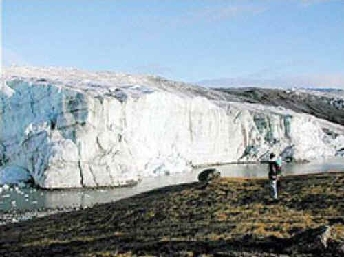 A researcher observes the edge of the Greenland Ice Sheet in 2001. (Image courtesy of Ted Scambos, National Snow and Ice Data Center, University of Colorado at Boulder) Since the industrial revolution, human activity has released ever-increasing amounts of carbon dioxide and other greenhouses gases into the atmosphere, leading to gradual but unmistakable changes in climate throughout the world-especially at the higher latitudes. Average surface temperatures in the Arctic Circle have risen by more than half a degree Celsius (0.9 degrees Fahrenheit) per decade since 1981. Sea ice Polar bears, unable to cross thin or nonexistent ice to hunt seals, will soon face a severely reduced food source. Scientists fear that with continued melting, the bears may become extinct by the end of the century. Seals, walruses, and seabirds will also lose key feeding and breeding grounds along the ice edge. Marine transport through the Arctic is expected to increase as ice melts and new shipping routes become available. The length of the navigation season along the Northern Sea Route is projected to increase to about 120 days by 2100, up from the current 20-30 days. While this could have positive economic effects, some observers worry about the environmental costs that might accompany increased ship access to Arctic waters, such as oil spills and fishery depletion. Arctic permafrost has warmed by up to 2 degrees Celsius in recent decades, with soils thawing to greater depths. By the end of this century, the southern permafrost boundary is projected to shift northward by several hundred kilometers, changing regional vegetation patterns. An estimated 15 per cent of the Arctic tundra has already been lost since the 1970s - an area roughly three times the size of California. As permafrost thaws, unstable ground shifts or subsides, damaging buildings, roads, pipelines, and other infrastructure in areas such as Alaska and Siberia. Greenland melt Satellite data show Greenland's ice has been melting at higher and higher rates every year since 1979. A conservative estimate of annual ice loss from Greenland is 50 cubic kilometres (12 cubic miles) per year, enough water to raise the global sea level by 0.13 millimeters a year. The Amundsen Sea region in the West Antarctic has experienced some of the world's greatest temperature change, with annual temperatures up 2.5 degrees Celsius over the past 60 years. The glaciers flowing into the sea from the Antarctic continent have been getting thinner for the past 15 years, and ice shelves in the region have decreased by more than 13,500 square kilometers since the 1970s. Since the collapse of the Delaware-sized Larsen B Ice Shelf in 2002, satellites have shown a two-to six-fold increase in the speed of glaciers flowing toward the former ice shelf. While most glaciers typically move a few centimeters to several hundred meters annually, these glaciers are currently moving as much as 1.5 kilometers each year. This type of acceleration has been witnessed throughout Antarctica and Greenland when ice shelves collapse, removing the barrier to the sea for interior glaciers and quickening the rate of fresh water loss to the ocean. Glaciers in West Antarctica are discharging about 250 cubic kilometers of ice and water into the ocean per year, 60 per cent more than is accumulated in their catchment areas - a net change sufficient to raise global sea levels by more than 0.2 millimeters per year. Andean glaciers In South America, Andean glaciers have been melting three times faster in recent years than they were in the mid-twentieth century. Bolivia's Chacaltaya, once home to the world's highest ski slope, is estimated to be a mere 2 per cent of its former size. It lost two-thirds of its mass in the 1990s alone and may disappear completely by 2010. Shrinking glaciers may mean a loss of power in Peru, where 70 per cent of electricity comes from hydroelectric turbines powered by the annual runoff from glaciers. In fact, millions of people living in Asia and South America rely on glacial runoff for drinking water and irrigation. If the glaciers disappear, severe water shortages are sure to follow. Meanwhile, rapidly filling glacial lakes in both the Andes and Himalayas threaten to break their banks and flood towns below. In Europe, shrinking glaciers and snow cover in the Alps are undermining the continent's ski and tourism industries. By 2025, Alpine glaciers are likely to contain only half their 1970s volume, dwindling to 5 percent by the end of the century. Pollution from European cities does not help the situation: scientists have measured black carbon concentrations atop these mountains high enough to double the area's absorption of sunlight. Such widespread glacial melting has local as well as global effects. Global sea level has risen 10-20 centimeters in the past century. According to the Intergovernmental Panel on Climate Change (IPCC), up to 1 meter of sea level rise is projected by 2100, with half the rise attributed to melting ice and half to thermal expansion. As sea level rises, inundation and loss of coastal land will force millions of people to relocate. Warming and melting could force local plant and animal species to adapt or relocate-an increasingly difficult proposition as wildlife habitats are fragmented by expanding human populations. Changes to the food base of ecosystems, such as decreases of algae and plankton in the Arctic Ocean, could have a ripple effect all the way up to the top predators, including the people who hunt and fish these animals. Melt waters Melt water on top of glaciers and ice sheets contributes to fracturing and destabilization of the ice masses and increases flow rates as the water lubricates the underside of the ice. Thawing tundra releases trapped carbon dioxide and methane from newly created wetlands, contributing to further warming. Finally, increased fresh water from melting glaciers and sea ice could alter ocean circulation patterns and dest