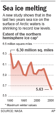 Arctic sea ice shrinking faster, NASA findsResearchers cite global warming in one study, winds in another MSNBC A pair of new studies shows that winter sea ice in the Arctic has shrunk dramatically in the past two years and that perennial ice in particular is disappearing. Two types of sea ice cover the Arctic Ocean: thick perennial ice that resists thaw year-round and thinner seasonal ice that melts during the summer and freezes again in the winter. Both types are experiencing decline, according to analyses of microwave satellite data. Researchers led by Joey Comiso of NASA's Goddard Space Flight Center in Greenbelt, Md., found that the amount of ice covering the Arctic has declined by 6 percent over each of the last two winters, compared to a loss of merely 1.5 percent per decade since 1979. Comiso's team did not distinguish between perennial and seasonal ice,