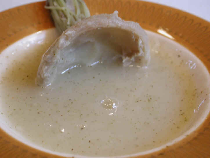 (Artichoke - 10) Dip the artichoke heart in the dipping sauce and enjoy. It's the prize! If the outside of the stem is "stringy," you can squeeze or scrape out the tasty center. Some stems are very tender and can be eaten in their entirety. Enjoy!