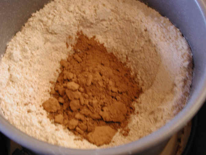 (Flour - Carob) After all the flour has been added to the dough mixer or bread maker, hollow out the center of the flour to make a "bowl", and add 1/4 cup of carob powder to make a dark bread.