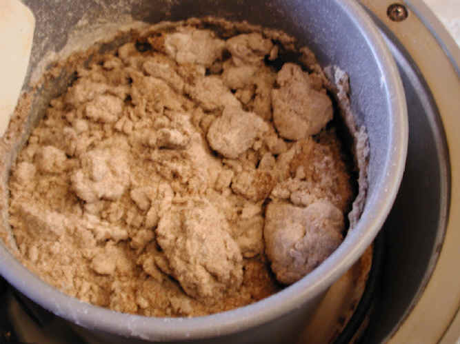 (Mixing) As the flour and water begin to mix together to form the bread dough, it begins to clump as shown in this photo. Add a little additional water and continue mixing. Use your rubber spatula to scrape down the dough that has stuck to the sides of the mixing container.
