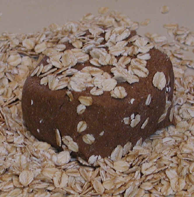(Shaping - 4) The fourth and final step in the shaping process of the 12 rolls is to take each 1/12 cut of the "log" and press the cut ends into the oats and re-form into the desired shape, as pictured above. Then place each oat coated dough piece on the baking pan which has been covered with a dusting of corn meal.