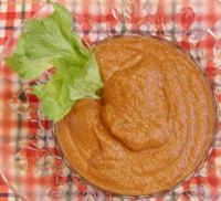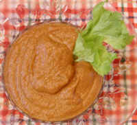 3 cups Lentils, cooked 1 Onion, medium size 1 - 6-oz. can Tomato Paste 1/2 cup Lemon Juice 1 cup Water 1 tbsp. Chili Powder 1 tbsp. Cumin, ground 1-1/2 tsp. Basil, dried 1-1/2 tsp. Cilantro, dried Hot Sauce or Cayenne Pepper, to taste 1/16 tsp. Stevia Extract Powder (optional to sweeten) (To enlarge the photo of the lentil dip, click on the photo or link) |