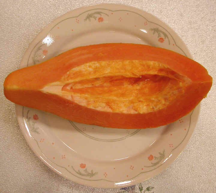 This is 1/4 of a ripe large red papaya that is ready to eat.