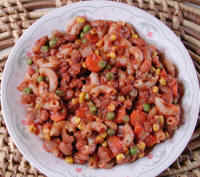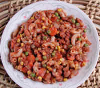 1 lb. Whole Wheat Elbows 2 lbs. Pinto Beans, dry 2 lbs. Carrots 2 lbs. Onions 1 lb. Corn Kernels, frozen 1 lb. Peas, frozen 1 - 28-oz. can Crushed Tomatoes 2 - 6-oz. cans Tomato Paste 3 tbsp. Oregano, dried 1/2 tsp. Fennel Seed, whole Hot Sauce or Cayenne Pepper, to taste (To enlarge the photo of the pasta fazool with pinto beans and veggies, click on the photo or link) |