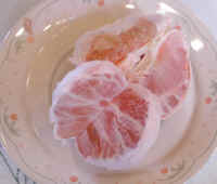 Place each half on a plate, and separate it into individual sections. The pummelo sections can also be combined with other fruit to make a fruit plate. Eat and enjoy. (To enlarge the photo of the pummelo, click on the photo or link) |