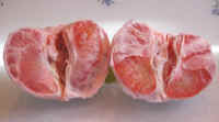 This is a closer look at one of the halves of the pummelo with its bright red color. (To enlarge the photo of the pummelo, click on the photo or link) |