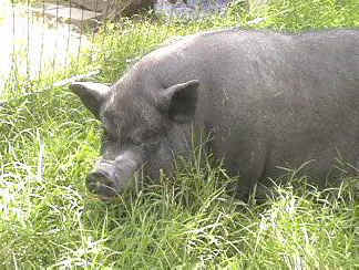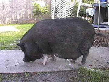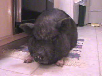 Lily. Lily is a spayed female, approximately 4 years old. After being in my care for nearly a year now, Lily is still looking for a special home. She is housetrained, very affectionate, VERY smart and inquisitive and has no bad habits (unless you leave bags of food, containers of pet food, garbage, etc down where she can find them!). She does not root and must be a house pig with yard privileges. Lily does not like dogs and must be supervised around them. Lily would not be a good pig to have around small children. Lily is a busy pig! She is very special and will steal your heart if given a chance!