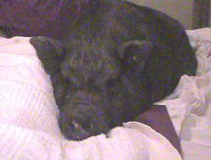 I have never been frightened of a pig until Lily came along. Lily was vicious and she could do very serious damage if she were successful in her attempts to bite. I couldn�t spank or hit her, that is what she expected and it would only infuriate her further. So, to correct Lily took a somewhat unusual approach and one not meant for the novice! When Lily went into the attack or threatening mode, I had to CAREFULLY (and quickly, I might add!) get hold of her and tip her over onto her back, holding her there until she settled down. It took several months for Lily to come around, but now, she is the most loveable and personable pig ever! She is so cute. She loves to be busy and will get into things quickly, if you aren�t paying attention! She was learning to paint before she was torn from our home by our City Council, which passed a new ordinance prohibiting having more than one PBP per household. We are still going through the legal process challenging this new law, but until it is settled, Lily and all of my piggies have had to take shelter in a sanctuary. I miss them terribly, especially Lily. She is a special girl. She needs a loving home in which she will be the only pig or have only one other companion pig. Who knows, she may become rich and famous for her "Pigasso�s" someday!