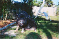 Stevie�s story is a sad one, which unfortunately, is too often repeated. Abandoned at an animal control facility with his 3 other herd members, Stevie and his friends languished for several months in "prison" surrounded by barking dogs. These pigs were too large and obese to be adopted, after all, people want cute, little animals. These 4 pigs were hopeless. (To enlarge this photo of Stevie, click on the photo or link.)