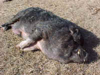 Poor Stevie was "fat blind" and nearly deaf. This is common among pigs that are allowed to become obese. The fat stretches their skin and forms folds which fall down over the eyes, blocking their vision. Poor Stevie had no idea that food or water were even being offered! He lay there in the only safe place he could find, away from the steer that shared the pasture and the other strange pigs that he couldn�t see. He was skin and bones. I nearly cried. . (To enlarge this photo of Stevie, click on the photo or link.)