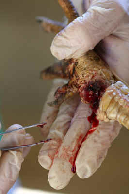 Unfortunately, while the legs of the hens grew, the bands did not. More than 90% of the hens had deeply embedded leg bands, some to the bone.