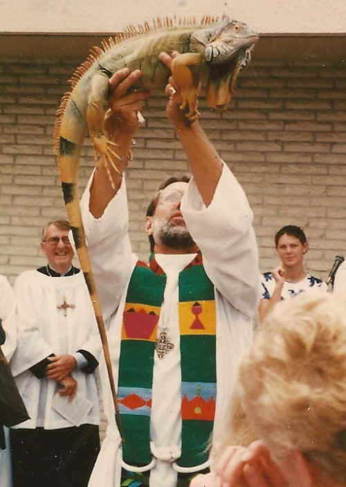 One of many clues and a piece of the puzzle is noticing people or activities that inspire you. Below is a photograph of The Very Rev’d Canon Peter D. Haynes of St. Michaels & All Angels Episcopal Church in Corona Del Mar, California blessing my son’s iguana “Zen.” I covered this blessing of the animals in the mid-90’s while I was a columnist for the Orange County Register’s local editions and realized how much this meant to God’s children.