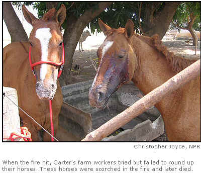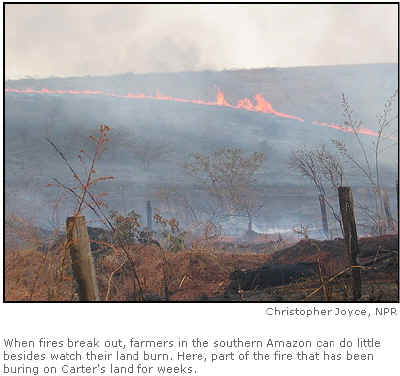 Carter thinks the fire burning on his land and that of his neighbors was deliberately set. The fire has scorched 90 percent of his 22,000 acre ranch. All Things Considered, November 5, 2007 � In Brazil, it's the end of the burning season, when people use fire to clear land for farms and ranches. But people also use fire as a weapon in range wars to push others off their land. Scientists say this fire cycle is not just destroying parts of the Amazon's southern forests, but altering the climate as well.
