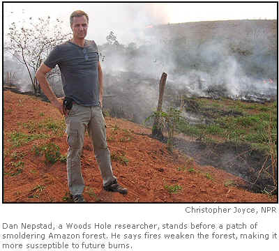 To Slow Amazon Fires, Scientists Light Their Ownby Christopher Joyce Morning Edition, November 6, 2007 � A few months ago, a team of scientists walked into a stretch of Amazon forest and purposely burned it. The scientists want to understand how burning forests contribute to climate change � and they want to know how to slow or stop those fires. But fire is everywhere in the Amazon. It's the way people clear land for agriculture and livestock. It also burns down a lot of forest that isn't meant to be cleared.
