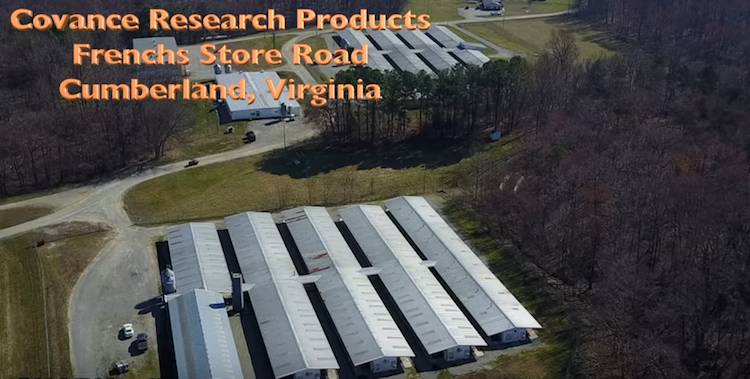 In March 2017, SHARK flew our drone over an animal concentration facility AKA Covance Research Products facility in Cumberland, VA, see video here. Amidst the cries of the distressed, imprisoned dogs, is the deafening loud waste processing system, undoubtedly adding to the trauma the dogs are experiencing. In addition to beagles, Covance breeds and warehouses primates, guinea pigs, rabbits, and pigs.