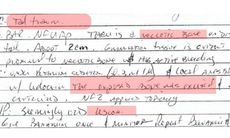a skin lesion and actively bleeding “tail trauma” that was deep