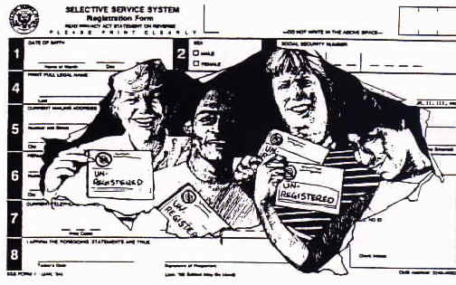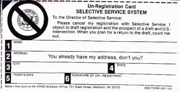 The Committee Against Registration and the Draft has started a national Un-Registration Campaign to help men like you say "no" to the draft. To un-register, just fill out the card at the bottom of this page and mail it to CARD�s Mid-west Office. We�ll collect the cards from around the country and present them to Selective Service.