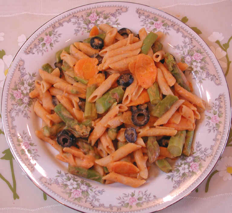 Asparagus, Carrots, and Olives with Penne and a Chipotle Lemon Bean Sauce