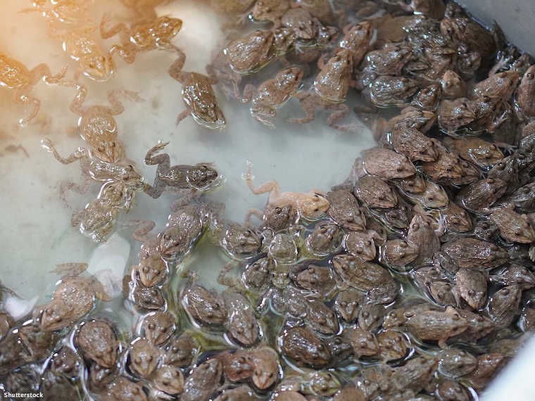 Bullfrogs raised on farms live in conditions that are so crowded they are often stacked on top of one another. When they are sold in live markets, they are piled into buckets. Now, these animals will be spared from being raised on farms, shipped across the world, and used for their flesh.